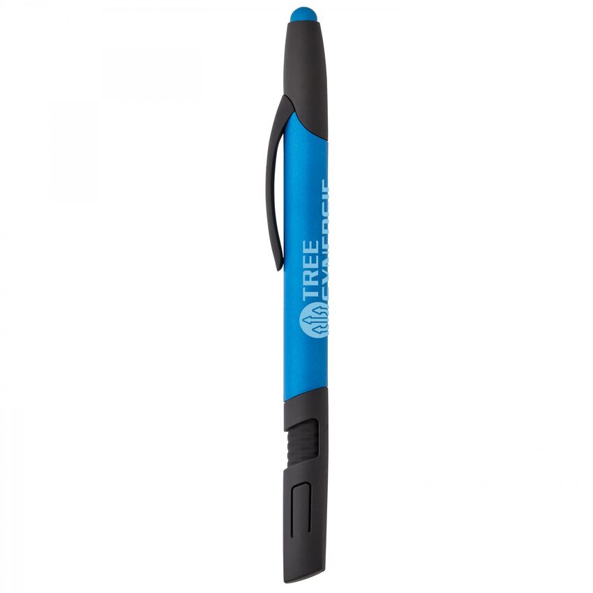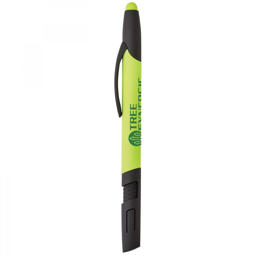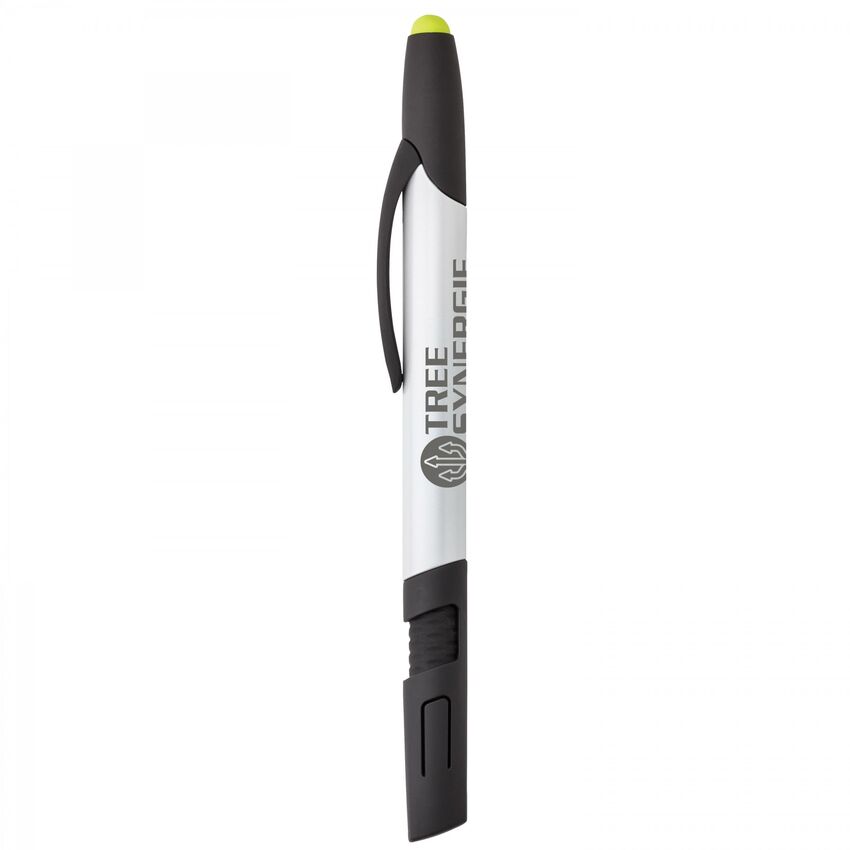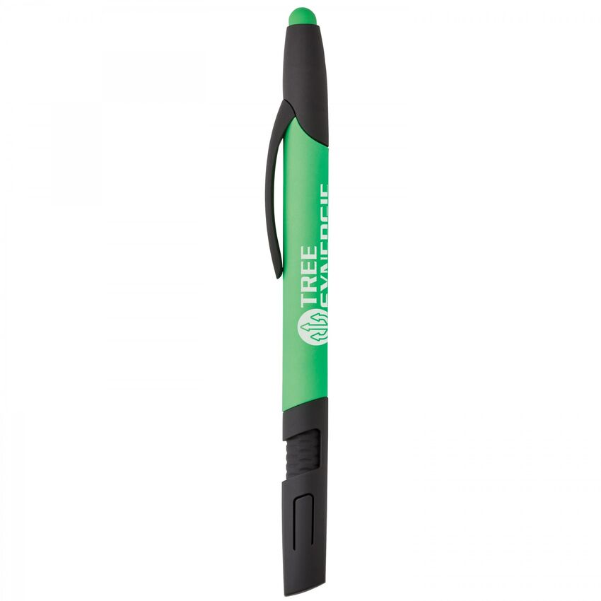Ce stylo 4-en-1 multifonctionnel se décline en plusieurs couleurs fluo vives qui font joliment contraste avec les garnitures caoutchoutées noires