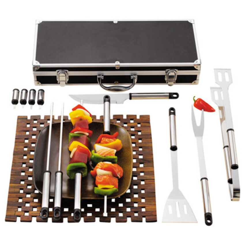 Ensemble de 13 pièces pour le barbecue comprenant une spatule, des pinces, un couteau, une fourchette, quatre brochettes, quatre pics pour le blé d'inde et un boîtier en alumininum pour contenir le tout