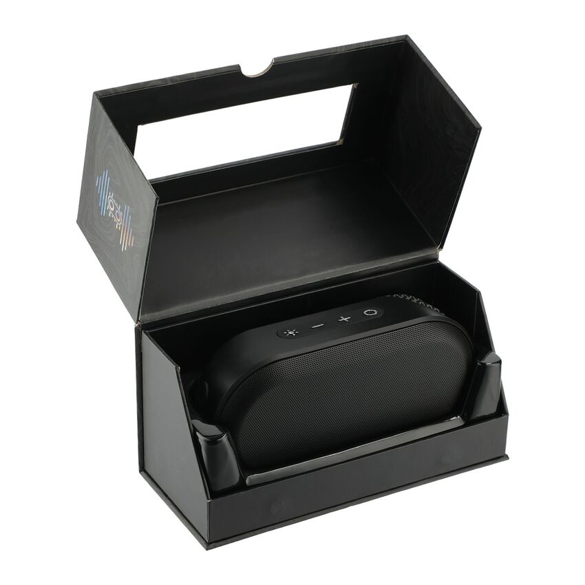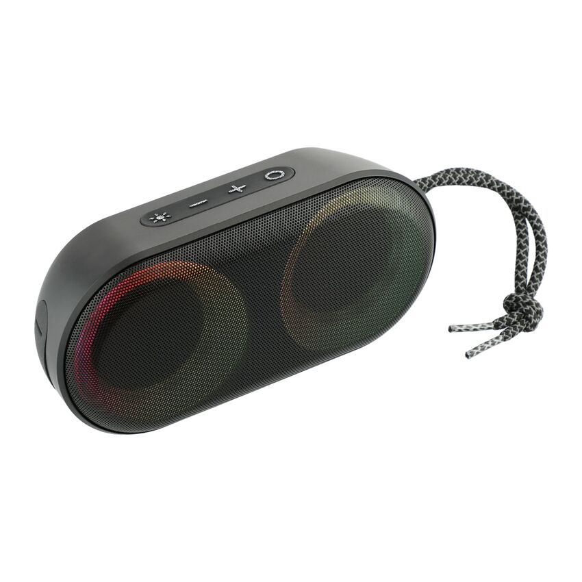 Le haut-parleur Bluetooth étanche extérieur Zedd avec lumières RVB basculera avec vous à l'intérieur ou à l'extérieur ! Le Zedd a un indice d'étanchéité IPx6, ce qui signifie qu'il peut résister aux tempêtes de pluie ou aux éclaboussures d'eau sans endommager le haut-parleur. Le haut-parleur Bluetooth® de 5 watts qui produira de la musique pouvant être entendue à l'intérieur ou à l'extérieur. Autour des haut-parleurs se trouvent des lumières RVB (rouge, vert, bleu) qui peuvent être ajustées selon vos préférences. Le haut-parleur est doté de commandes musicales intégrées et d'un microphone. Un câble de charge USB-A vers Type-C de 50 cm est inclus. Temps de lecture au volume maximum : jusqu'à 7,5 heures. Temps de charge : 2h30.