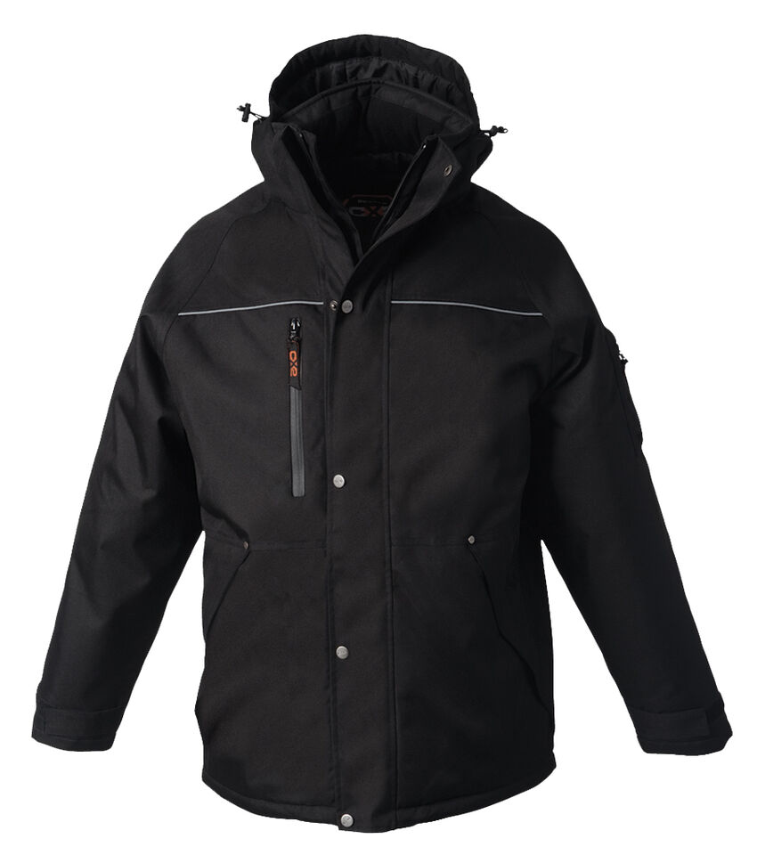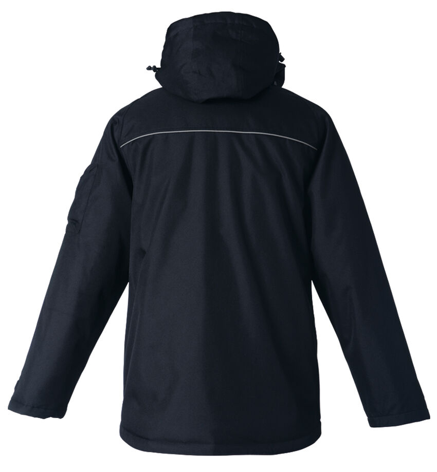 Fermetures éclair imperméables sur la poitrine et les bras avec deux poches inférieures zippées, fermeture éclair double sens sur le devant, capuche amovible, passepoil réfléchissant, fermeture à languette réglable sur les poignets et les poches intérieures.