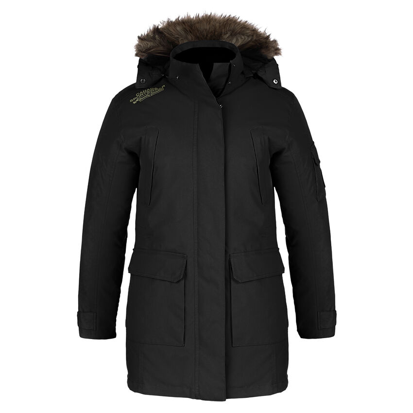 Coquille extérieure 100 % nylon avec enduit imperméable respirant. Vêtement doté de coutures complètement scellées et d’une entredoublure isolante Thermore. Capuchon et garniture en fausse fourrure amovibles. Neuf poches extérieures et deux poches intérieures. Poignets intérieurs contre les intempéries et cordon de serrage à l’ourlet. Glissière YKK à double curseur à l’avant.