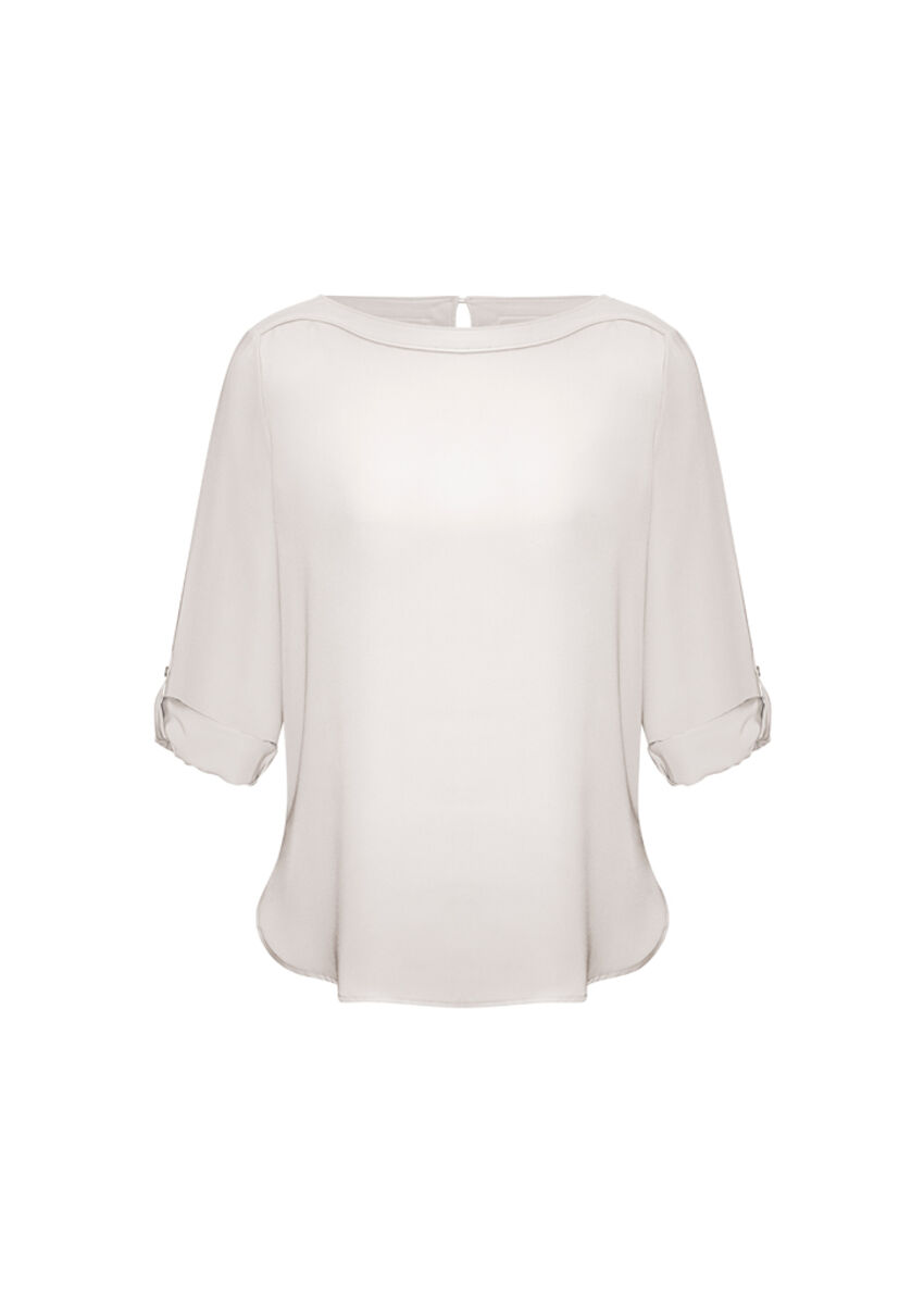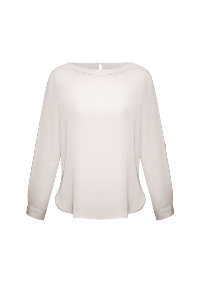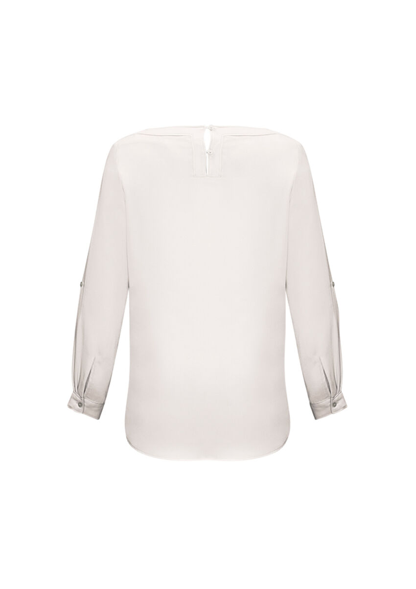 Tissu- Tissu 100 % polyester extensible mécaniquement- Tissu infroissable et sans tracas avec un drapé flatteurCaractéristiques- Col bateau finement cousu- Les manches ont une fonction polyvalente de languette enroulable- Longueur plus longue avec ourlet en pan de chemise conçu pour être porté ou rentré- Forme douce au niveau du torse pour une silhouette épurée