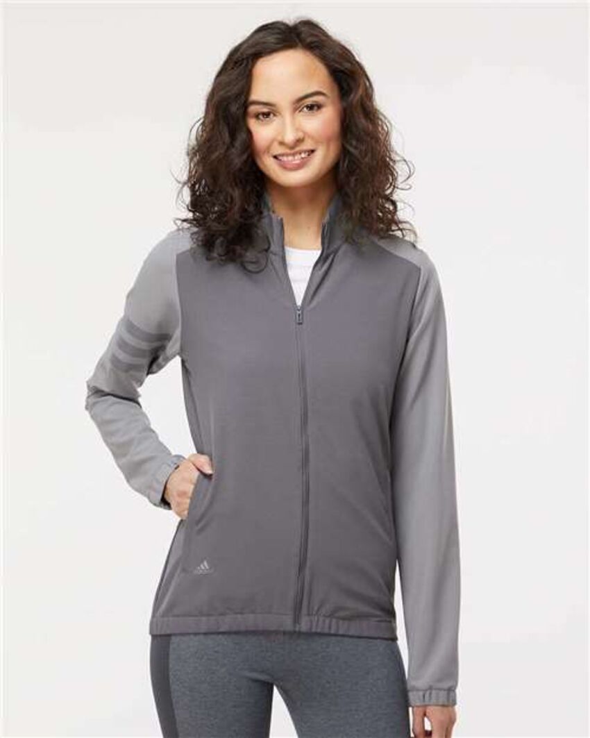 12 oz/verge linéaire, 94 % polyester recyclé, 6 % élasthanne tissage uniFinition hydrofuge durableVeste en tissu extensibleDemi-poignets élastiquesDeux poches frontales à fermeture éclairTrois bandes sur le bras droitLogo adidas performance de couleur contrastée sur le col arrière
